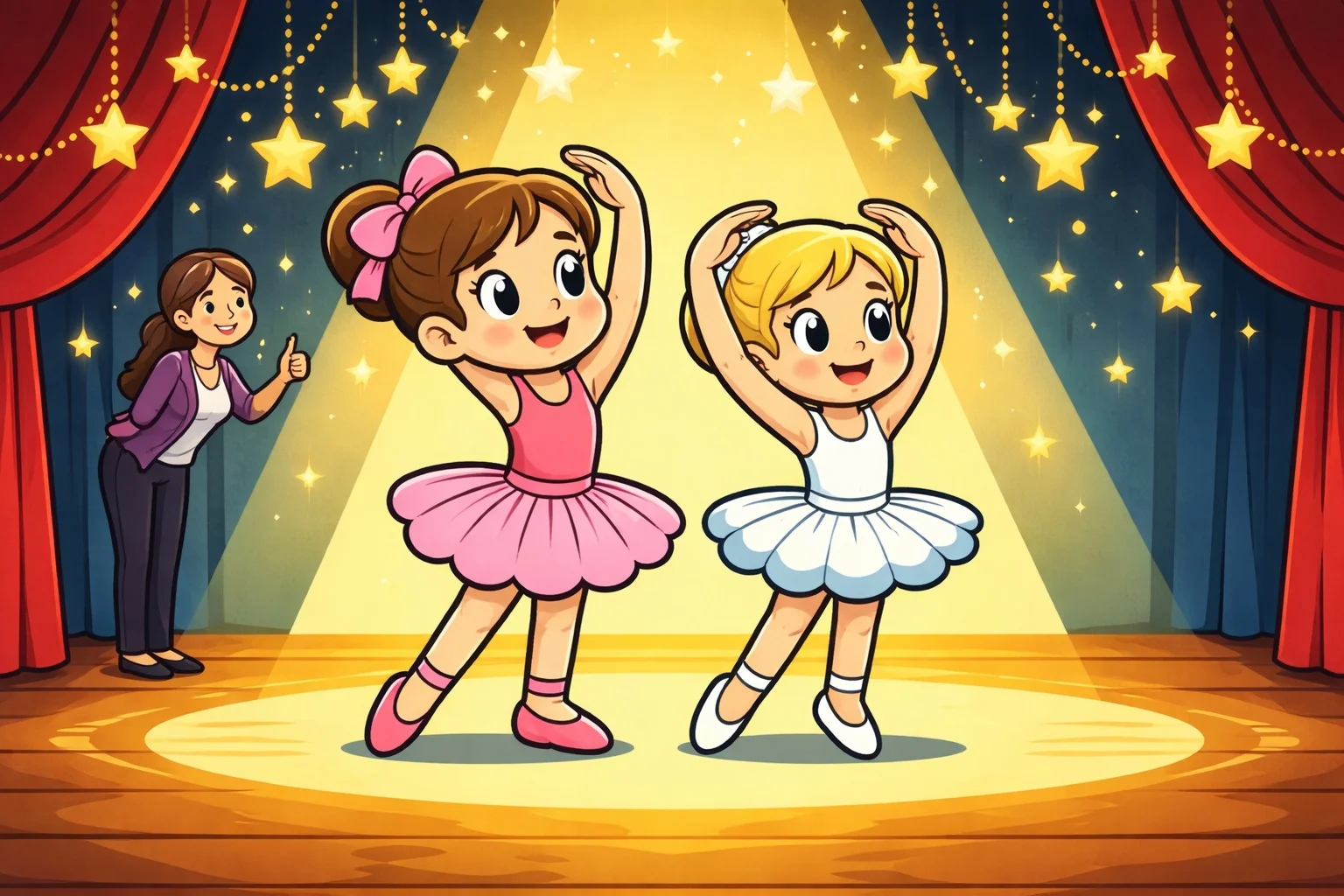 Sahnenin ortasında, iki küçük balerin silueti belirdi. Biri Defne’ye benziyordu, diğeri ise onun arkadaşı Nisan’a. İkisi yan yana durdu, kollarını yuvarlak bir şekilde kaldırdı. Sonra aynı anda gülümseyerek dans etmeye başladı. Her adımlarında yerden minicik yıldız tozu gibi ışık parçacıkları yükseldi.