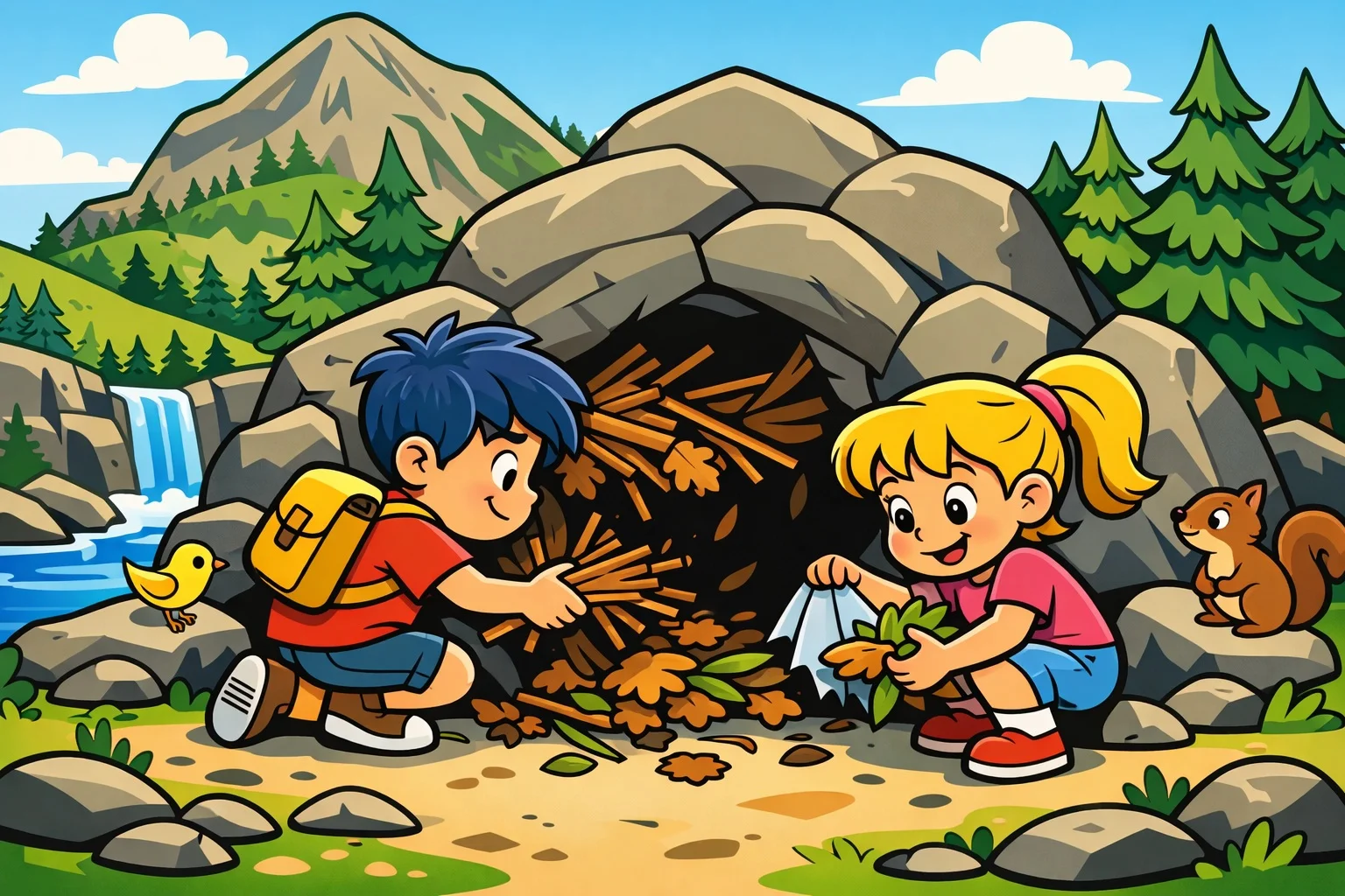 Mağara ağzına yaklaşınca, taşların arasında sıkışmış kuru yapraklar, ince dallar ve hatta rüzgârın sürüklediği küçük bir bez parçası görmüşler. Hepsi bir araya gelmiş, sanki mağaranın ağzına yumuşak bir tıpa olmuş.