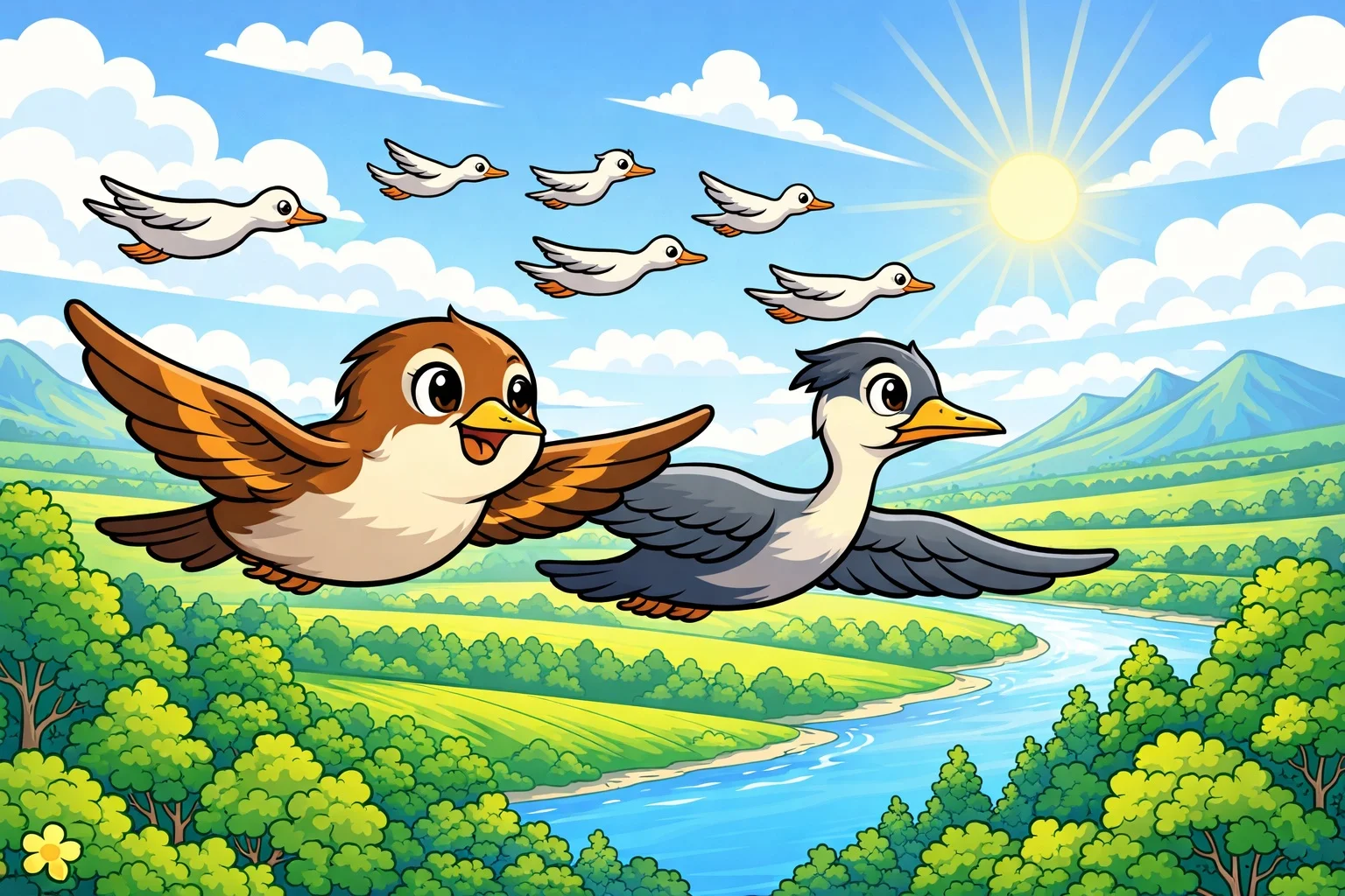 Bir sabah güneş henüz yeni doğarken Lora yuvasından başını çıkardı. Serin bir rüzgâr ağaçların yapraklarını hışırdatıyordu. Uzakta, gökyüzünde uzun bir V şeklinde uçan kuş sürüsü görünüyordu.
