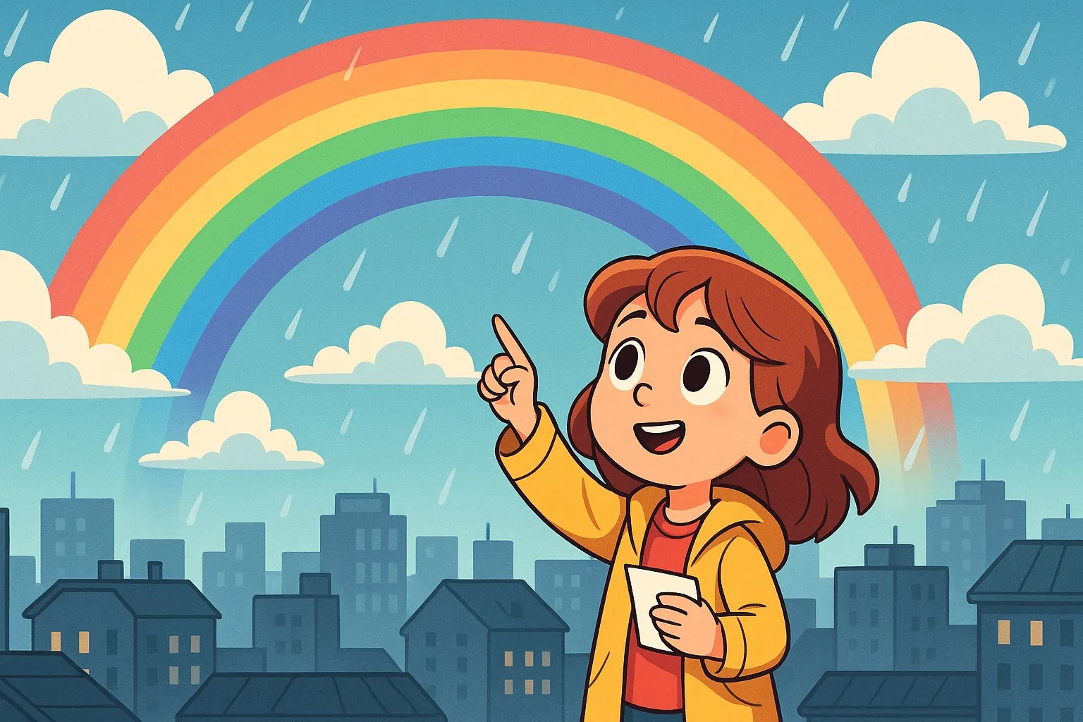 Bir yıldırım çakmadı, büyük bir ses olmadı. Sadece… gökyüzünde sessizce bir şey belirdi. Hafif bir kavis. Kırmızı… sonra turuncu… sonra sarı… ve diğerleri… GÖKKUŞAĞI!