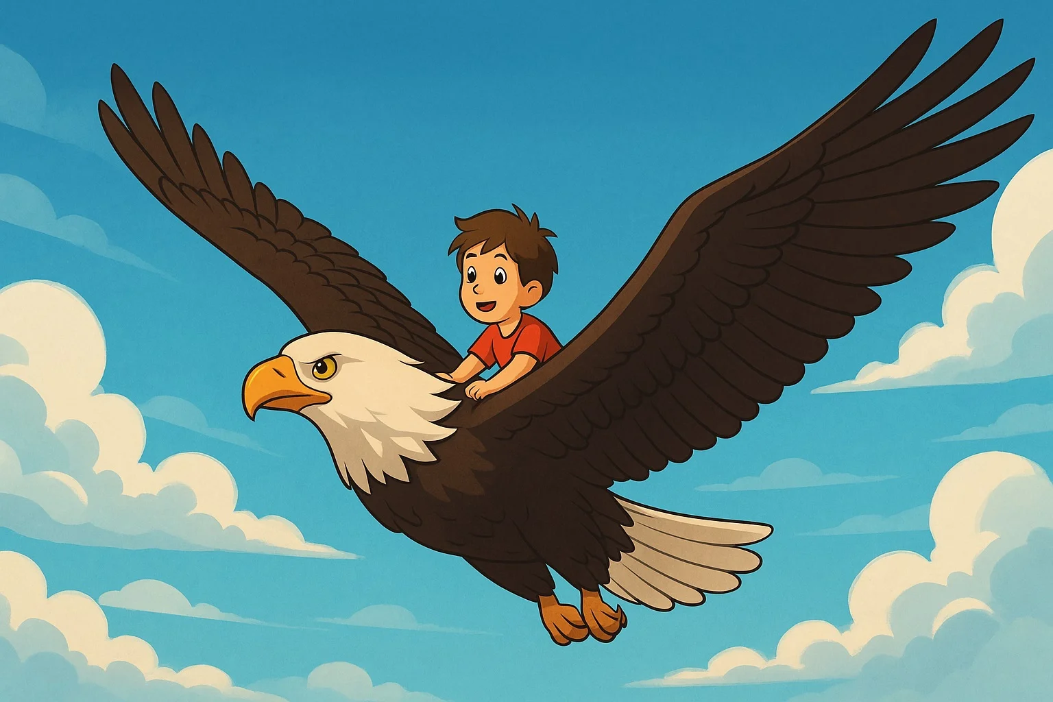 Böylece macera başlamış. Kartal onu sırtına almış ve bir anda göğe yükselmiş. Çocuk aşağıya bakınca köyü, ormanları ve nehirleri minicik görmüş.