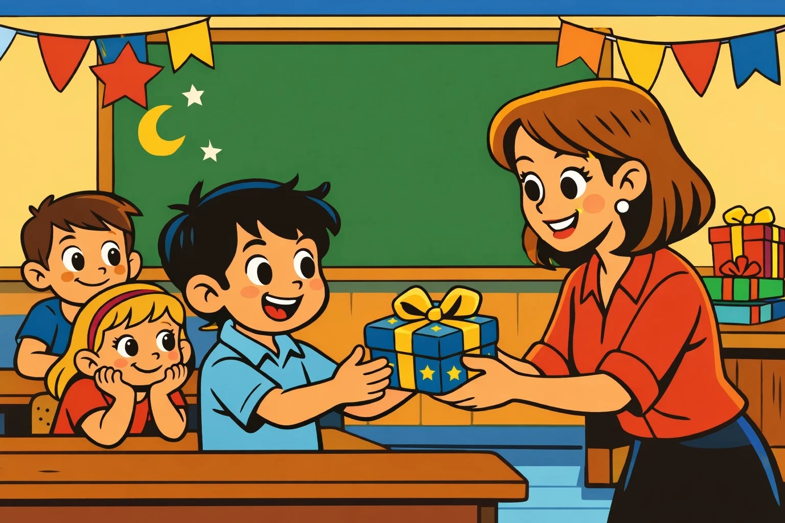 Ali okula koşar adımlarla gitmiş. Sınıfa girdiğinde kapının kenarlarına renkli kâğıt süsler asıldığını, tahtaya da “Mutlu Karneler Günü” yazıldığını görmüş. Masanın üstünde ise küçük paketler diziliymiş. Kimi kırmızı kurdeleli, kimi sarı, kimi mavi…