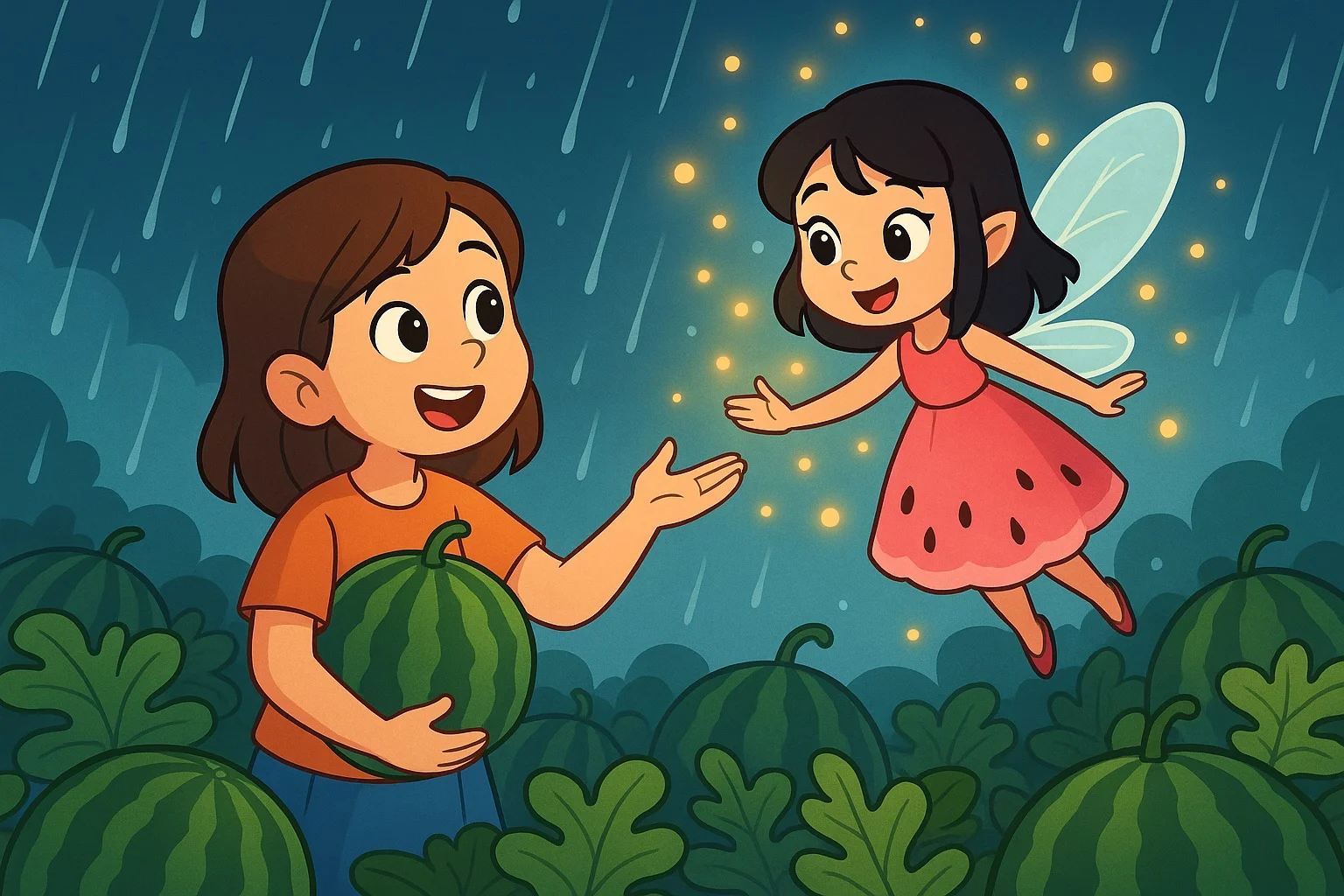 Karpuzun üstünden minik bir ışık sıyrılıp havaya yükselmiş. O ışığın içinden küçük, kanatlı bir peri çıkmış. Saçları karpuz çekirdeği gibi siyah, elbisesi ise pembe kabuk desenliymiş.