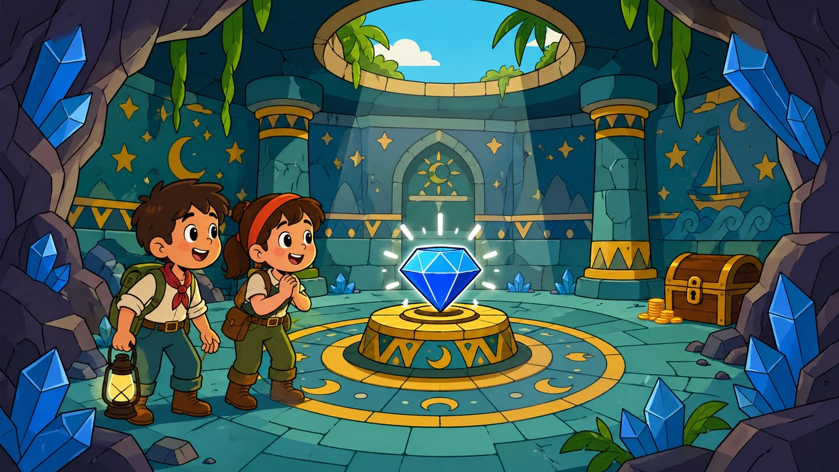 Karşılarında büyük bir oda vardı. Tavanı kristallerle kaplıydı. Duvarlarda yıldız resimleri, yerde ise ay şekilli taşlar vardı. Odanın tam ortasında altın bir kaide duruyordu. Kaidenin üzerinde Mavi Elmas parlıyordu. Elmas öyle güzeldi ki, sanki denizin mavisi, gökyüzünün ışığı ve ayın huzuru içine saklanmıştı.