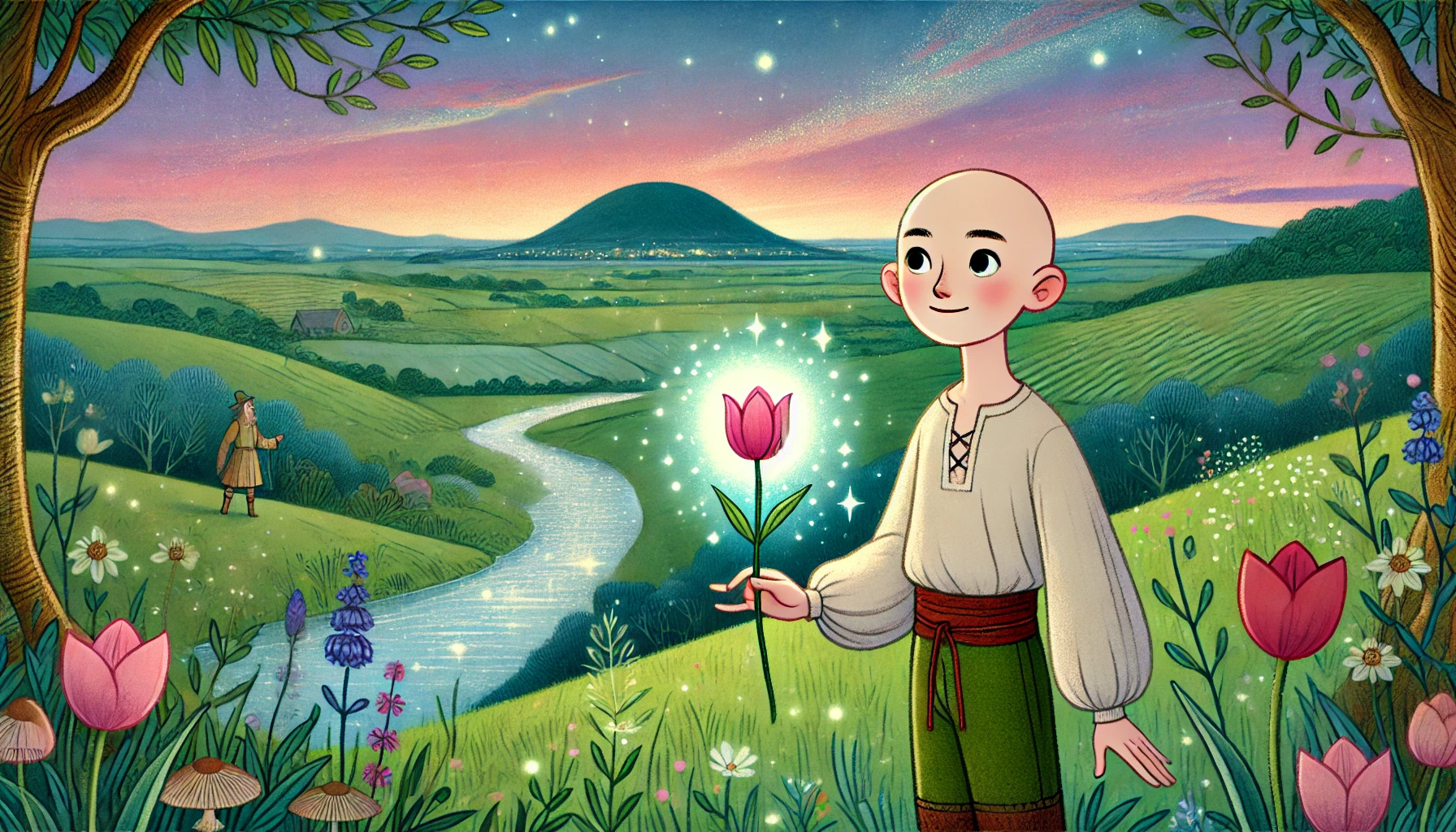 Yardım yoluna gitmiş, köydeki insanlara yardım etmiş. O anda birdenbire köyün ortasında sihirli lâle belirivermiş.