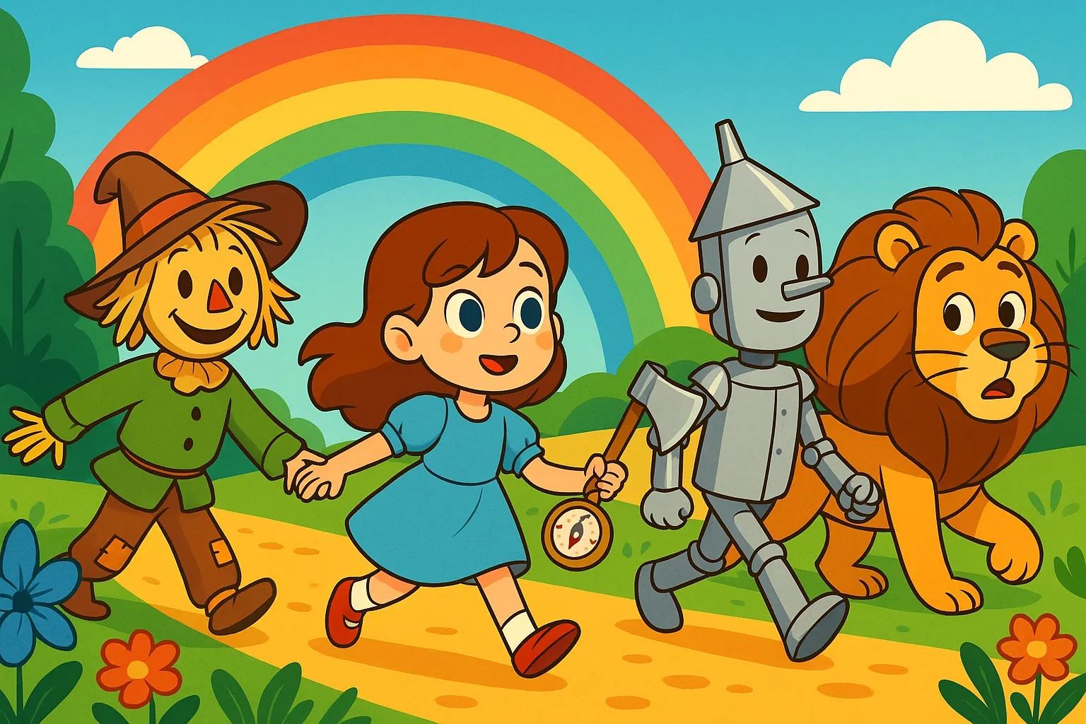 Böylece dörtlü – Korkuluk, Teneke Adam, Aslan ve Lina – pusulanın gösterdiği yöne doğru yola çıktı. Yol, eskiden sarı tuğlalarla döşeliydi ama şimdi her şey griydi. Pusula, onları Gökçe Ormanı’na yönlendirdi.