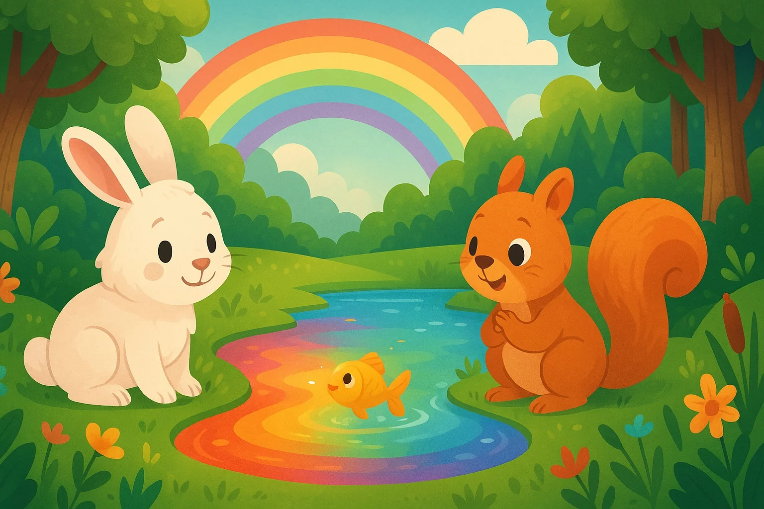Sonunda ağaçların arasından masmavi, parıl parıl parlayan bir gölet çıkmış karşılarına. Göletin suyu gökkuşağının tüm renkleriyle ışıldıyormuş. Kuşlar gökyüzünde dans ediyor, kelebekler suyun üstünde uçuyormuş.