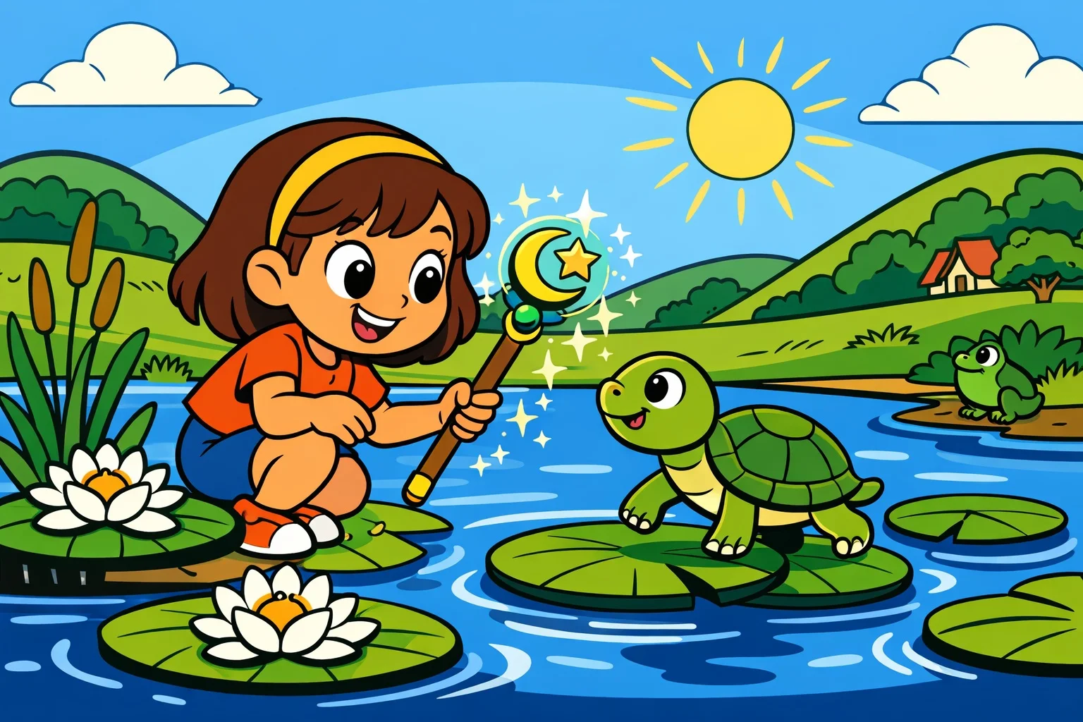 Sonra Sihirli Baston’u hafifçe havaya kaldırmış. Baston havada küçük ışık halkaları çizmiş. O anda gölden esen tatlı bir meltem, nilüfer yapraklarını kıyıya doğru nazikçe yaklaştırmış.
