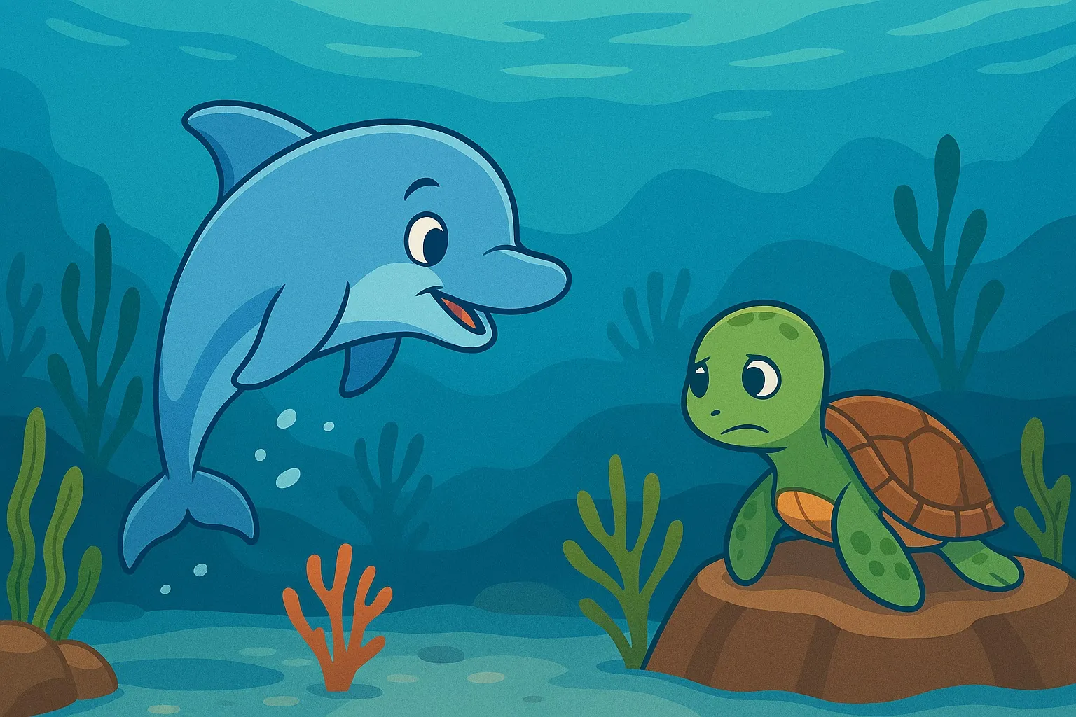 Mero o gün arkadaşlarıyla oyun oynamaya gitti. Ama diğer yunuslar dalgaların üzerinde eğlenirken, Mero’nun dikkati bir köşede yalnız oturan bir deniz kaplumbağasına takıldı. Kabukları yosunla kaplıydı, gözleri yorgun görünüyordu.